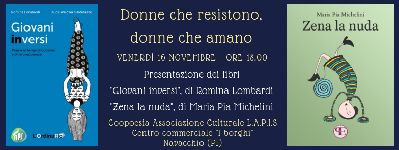 Saranno le donne, le loro emozioni e il loro amore per la vita, al centro dell'incontro "Donne che resistono, donne che amano", organizzato dall'Associazione culturale "L.A.P.I.S"., presso il Centro commerciale dei Borghi, a Navacchio, il prossimo 16 novembre, in collaborazione con l'associazione "Nati per scrivere". Durante l'evento saranno presentati i libri "Giovani inversi. Poesie in tempi di bullismo e altre prepotenze", di Romina Lombardi (NPS Edizioni, 2018), e "Zena la nuda", di Maria Pia Michelini (Panesi Edizioni, 2018), alla presenza delle autrici, che si confronteranno con il pubblico su tematiche delicate, quali il bullismo e l'accettazione di sé.